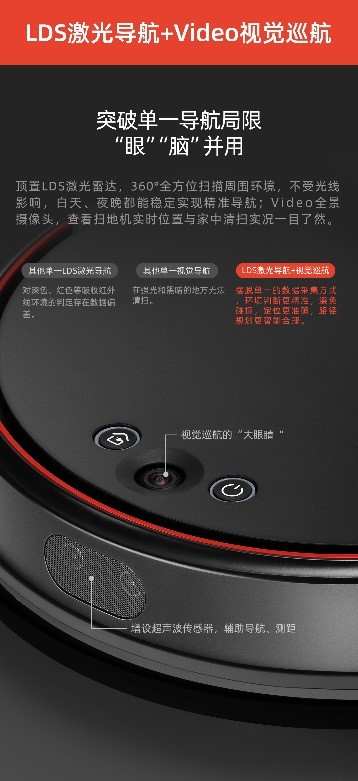 為了效率更高、更節(jié)能地實(shí)現(xiàn)清掃全屋,掃地機(jī)器人的導(dǎo)航系統(tǒng)是重中之重的功能。得益于技術(shù)的快速演變,激光導(dǎo)航技術(shù)已成為中高端掃地機(jī)的熱門配置,而小狗在此基礎(chǔ)上提出“LDS激光導(dǎo)航+視覺巡航”的融合解決方案——在LDS激光雷達(dá)基礎(chǔ)上,創(chuàng)新地增加了Video視覺巡航的模式,并采用超聲波傳感器輔助探測,借此拉大了與其他品牌的差距?!把邸薄澳X”的方案并用突破了單一導(dǎo)航局限性,環(huán)境判斷更精準(zhǔn),定位更合理,路徑規(guī)劃更智能。機(jī)器頂置LDS激光雷達(dá),能360°全方位掃描周圍環(huán)境,快速構(gòu)建和記憶家居地圖。超聲波傳感器具有極好的近距離偵測性能,可與LDS激光導(dǎo)航形成互補(bǔ),實(shí)現(xiàn)20厘米范圍內(nèi)的動態(tài)路徑規(guī)劃,減少漏掃與碰撞。而機(jī)器前部配置的video全景攝像頭,支持960P高清畫質(zhì),可實(shí)時關(guān)注家中狀態(tài),具備安防功能。功能豐富、操作簡單的APP遠(yuǎn)程操控,幫助用戶解放雙手束縛,工作休閑的同時,也能隨時指揮機(jī)器完成清潔工作。